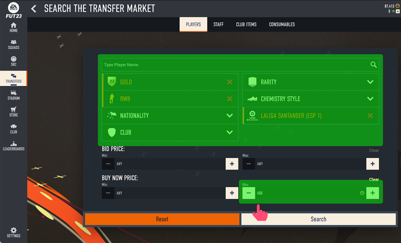 For example, your filter can be something like this: RWB > Argentina > La Liga > Max BIN price 450 (this is just an example that works at the moment I write the docs). Firstly I checked the price of the cards at minute 59 and I found out that if I set the max BIN price at 600, there will be just a few results.